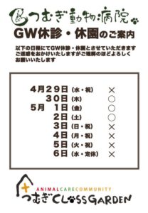 以下の日程で臨時休診、休園とさせていただきます ご迷惑をおかけいたしますがご理解のほどよろしくお願いいたします 4月29日(水・祝) 休診 30日(木) 通常診療 5月 1日(木) 通常診療 2日(土) 通常診療 3日(日・祝) 休診 4日(月・祝) 休診 5日(火・祝) 休診 6日(水・定休) 休診